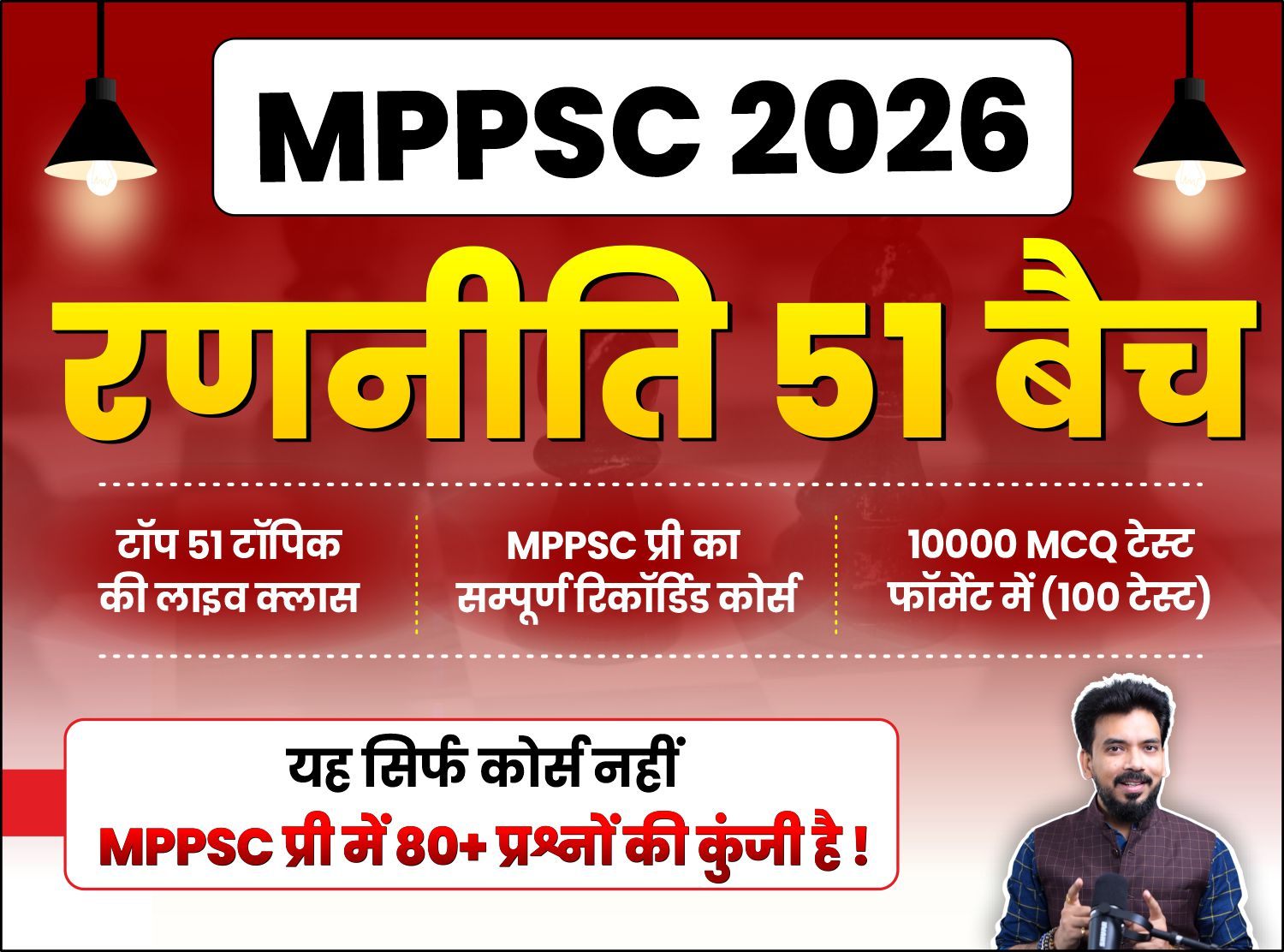 इस कोर्स के मुख्य रणनीतिक बिन्दु इस प्रकार हैं - 1. टॉप 51 टॉपिक की लाइव क्लास + पीडीएफ़ नोट्स 2. MPPSC प्री का सम्पूर्ण रिकॉर्डिड कोर्स 3. 10000 MCQ टेस्ट format में यानि लगभग 100 टेस्ट 4. सभी टेस्ट का विडिओ डिस्कशन जो रिवीजन मे हेल्प करेगा। 5. MPPSC प्री मेंटोरशिप गूगल मीटिंग के साथ जिसमे सभी फैकल्टी समय समय पर आपका मार्गदर्शन करेंगे। ये कोर्स आपको 80+ प्रश्नों के ऐसे टॉपिक कवर करवाएगा जिनकी तैयारी के बाद आप प्री मे शत प्रतिशत सफल हो सकें। शर्तें - 1. आपको रोजाना अपनी क्लास पूरी तरह से तैयार करनी होगी । 2. जो बुक लिस्ट या नोट्स आपको बताए गए हैं वो आपको बताए अनुसार तैयार करना होंगे। 3. आपकी लाइव क्लास मे उपस्थिति अनिवार्य है (हाउस वाइफ और जॉब वालों को छोड़कर ) सभी लाइव क्लास जॉइन करेंगे। 4. सभी क्लास और फैकल्टी द्वारा बताए गए नोट्स आपको कंठस्थ करना होगा । 5. सभी टेस्ट लगाना और उनके डिस्कशन देखना अनिवार्य होंगे । अगर आप ये सब करते हैं तो प्री 2026 मे एक सीट आपकी जरूर होगी। धन्यवाद । आपका, Anannd Mishhra